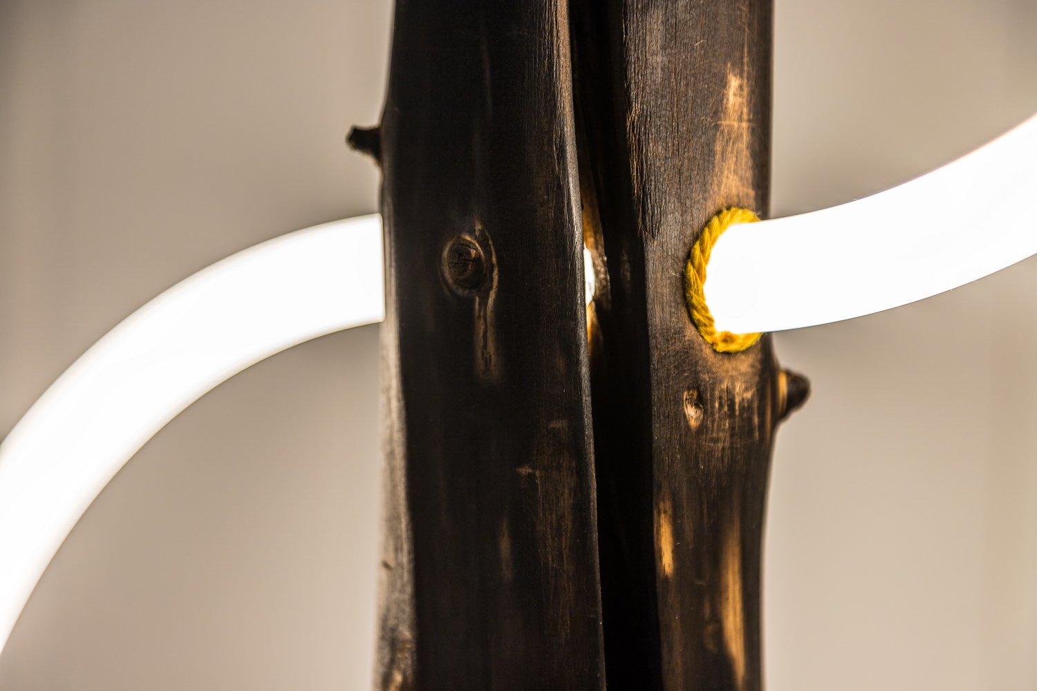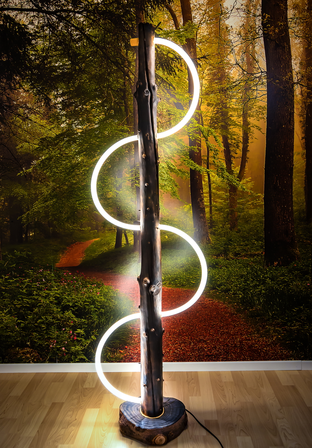 Holz: Tanne aus dem eigenen Garten Oberfläche: Feuer geschwärzt, gebürstet und matt lackiert. Leuchtmittel: LED Eglo Glow, 2500 Lumen, 3000 Kelvin Warmweiss Anschluss: 230V, 3m Steuergerät: LED Driver Eglo, im Lampenfuss Höhe: 185 cm Verkaufspreis: 550.- |