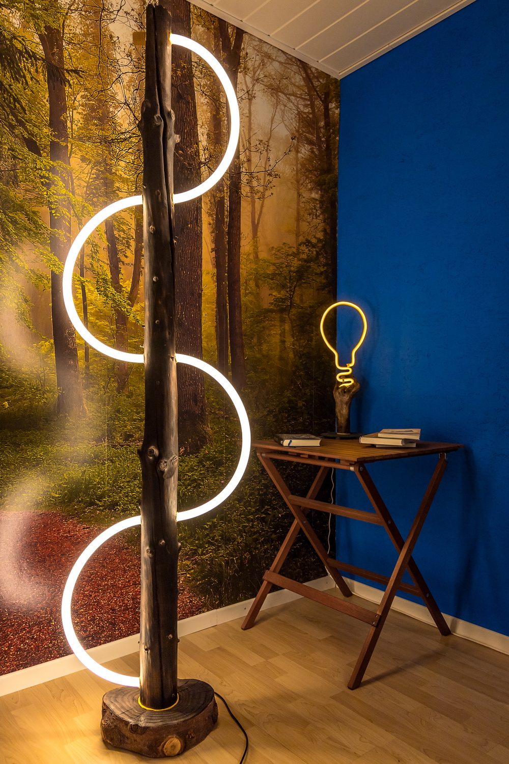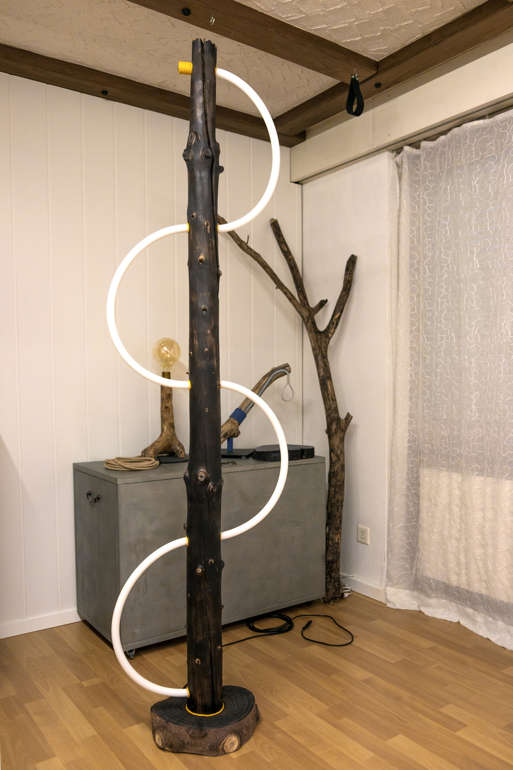 Holz: Tanne aus dem eigenen Garten Oberfläche: Feuer geschwärzt, gebürstet und matt lackiert. Leuchtmittel: LED Eglo Glow, 2500 Lumen, 3000 Kelvin Warmweiss Anschluss: 230V, 3m Steuergerät: LED Driver Eglo, im Lampenfuss Höhe: 185 cm Verkaufspreis: 550.- |